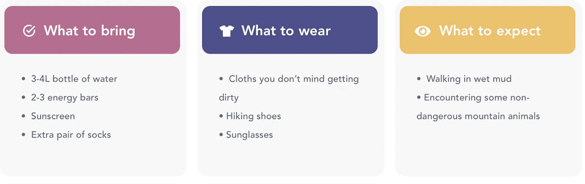 Managing Expectations Early: 100% of the users forgot to bring something while on their trip. This is why, we added a highlighted sections that includes “What to bring, What to Wear, and What to Expect”