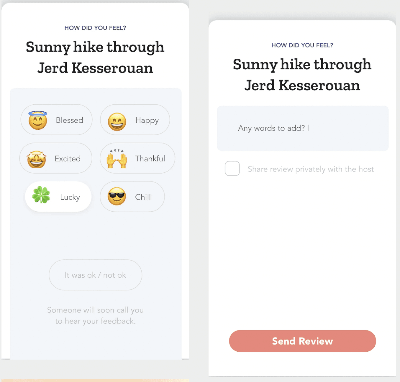 Memories as primary KPI: Our intention was to test the whole experience and not just the app. This is why, we informed our users that they will actually be attending the activities they book. After each session, the end users had to go through the preparation phase before the activity, use the app there, and get back to use with all their comments and feedback.We focused on those Awe moments of captivating sights, fun encounters, accidents, and feelings after each activity.