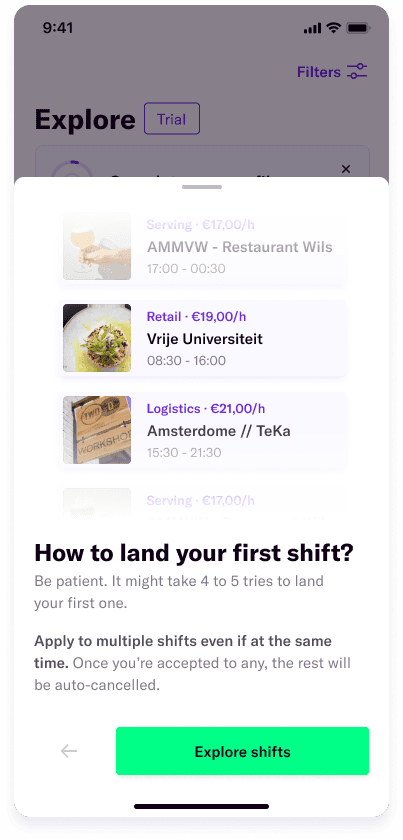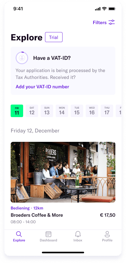 Users who have proven to be eligible to work were offered a chance to work and get paid for 1 shift before requiring a valid VAT ID.