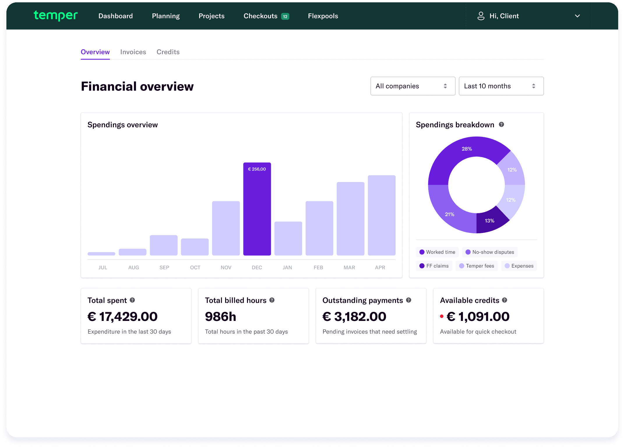 Data overview to share insights on spendings, breakdown, and financial behavior on Temper.